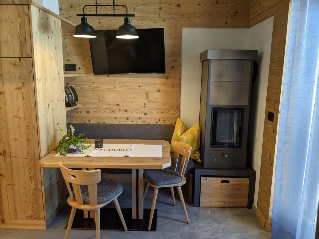 Unsere Wohnung mit einem großen Schlafzimmer in Naturholz und Böden aus heimischer Lärche, ist der ideale Platz für Sonnenanbeter: Das gesamte Appartment hat einen großen Rundumbalkon mit Blick auf die Pragser Dolomiten und den Kronplatz! Für Relax und Behaglichkeit sorgen die Wohnecke mit Kachelofen und die Physiotherm Infrarotsauna!